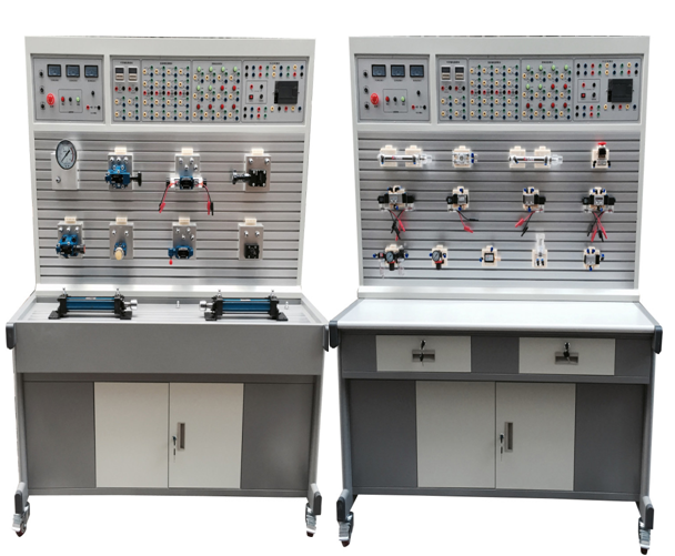 液压与气压传动PLC控制综合实训装置采用“二合一”结构,配备两套实验设备,一套为气动与PLC实训平台,另一套为液压传动与PLC实训平台,且各自配有独立的PLC电气控制设备。
