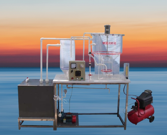 沉砂池除砂效率可达 95 %(砂粒粒径≥ 0.297mm ),有机物分离效率约 70 %。在我国有应用实例。其设备上部一圆形体,同侧设有进出水口,下部一小圆形体,当中是锥体,设有叶片转动,强把进水砂粒向下沉降。小圆聚砂体中央有一根砂粒提升管,用压缩空气把砂排出。