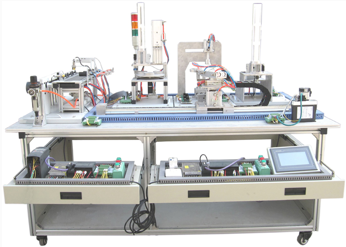 实训装置由由铝合金导轨式实训台、典型的机电一体化设备的机械部件、 PLC 模块、变频器模块、按钮模块、电源模块、模拟生产设备实训模块、接线端子排和各种传感器、计算机等组成。整体结构采用开放式和拆装式,实训装置用于机械部件组装,可根据现有的机械部件组装生产设备,也可添加机械部件组装其他生产设备,使整个装置能够灵活的按教学或竞赛要求组装具有生产功能的机电一体化设备。模块采用标准结构和抽屉式模块放置架,互换性强;按具有生产性功能和整合学习功能的原则确定模块内容,使教学或竞赛时可方便的选择需要的模块。设备需完全符合电工电子全国职业技能大赛所要求,同时还要求具有可拓展功能,可以组成更加大型的生产模拟系统,以配合各个用户学校不同层次,不同专业的教学及培训要求。