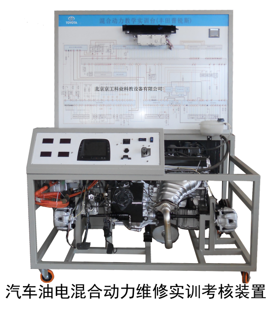 丰田普瑞斯1.5L油电混合动力系统总成(包含原车电控发动机、油电混合驱动桥、HV蓄电池等附件总成)、原车油电混合动力系统控制电脑、电子油门加速机构、组合仪表、油电混合动力起动运行所有相关的原车附件、故障模拟考核和排除系统、原车电路原理图板及检测端子、备用60AH大容量蓄电池、大容量不锈钢油箱、油电混合动力加速机构、控制面板柜、可移动台架、台架备用电源总开关、原车故障检测通讯的诊断座、散热系统、台架操作说明书、实验指导书等附件。
