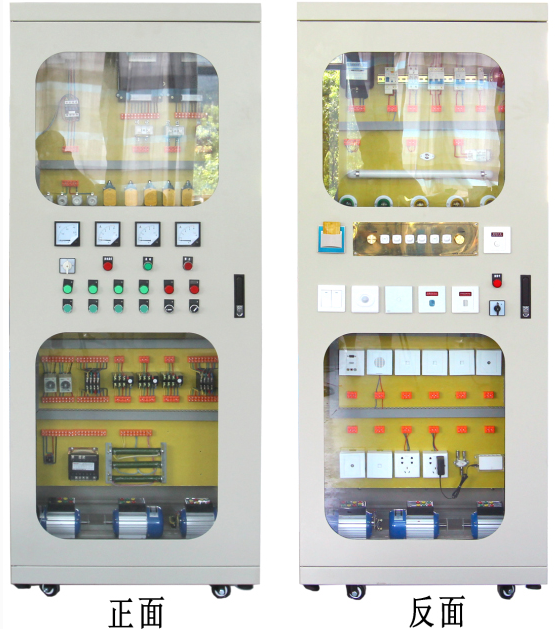 1、本装置采用正反二面开门的离墙式威图电气控制柜,且正反面同时都可以操作,柜体中宽度能保证两个学生同时合作接线实训的需要,其外形尺寸宽×厚×高分别为: 800 × 600 × 2000 mm 。柜体采用厚度为 1.5 以上的优质钢板,柜门采用厚度为国标 2.0 以上的优质钢板并安装四块大的玻璃,学生能通过玻璃看清柜内各元器件及相应的动作,金属表面喷塑,柜体中间有二块优质环氧树脂绝缘板和相应的支架系统隔离正反两个柜体,安装板上安装智能建筑电气控制线路各实训考核模块。各元器件所有的接线端都连接至相应的专用实训接线端子上,每个接线端上都套有用电脑打印接线端名称及编号的套管,并且更换方便。被控制电机安装于电气控制柜内。
